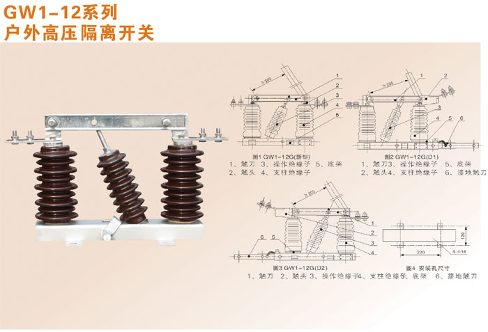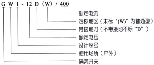 產(chǎn)品的電器和機(jī)械性能符合國(guó)家標(biāo)準(zhǔn)GB1985《交流高壓隔離開(kāi)關(guān)和接地開(kāi)關(guān)》的規(guī)定要求。其中型號(hào)包括:GW1-12/200A,GW1-12/400A,GW1-12/630A,GW1-12/1000A,GW1-12/1250A;防污型:GW1-12W/200A,GW1-12W/400A,GW1-12W/630A,GW1-12W/1000A,GW1-12W/1250A; GW1-12型單接地:GW1-12D/200A,GW1-12D/400A,GW1-12D/630A,GW1-12D/1000A, GW1-12D/1250A;