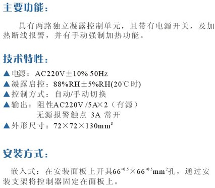 具有兩路獨(dú)立凝露控制單元,且?guī)в须娫撮_關(guān),及加熱斷線報(bào)警,并有手動(dòng)強(qiáng)制加熱功能。