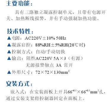 具有三路獨立凝露控制單元,且?guī)в须娫撮_關(guān),及加熱斷線報警,并有手動強制加熱功能。